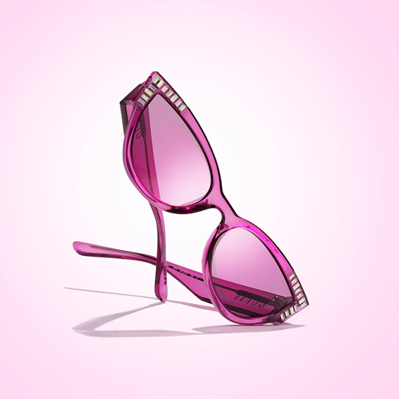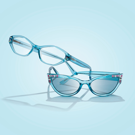 A light cat-eye frame with a retro vibe, accented with exclusive contemporary details. The crystal embellishment on the temples and the lively colors of the frame emphasize its young, vibrant soul.