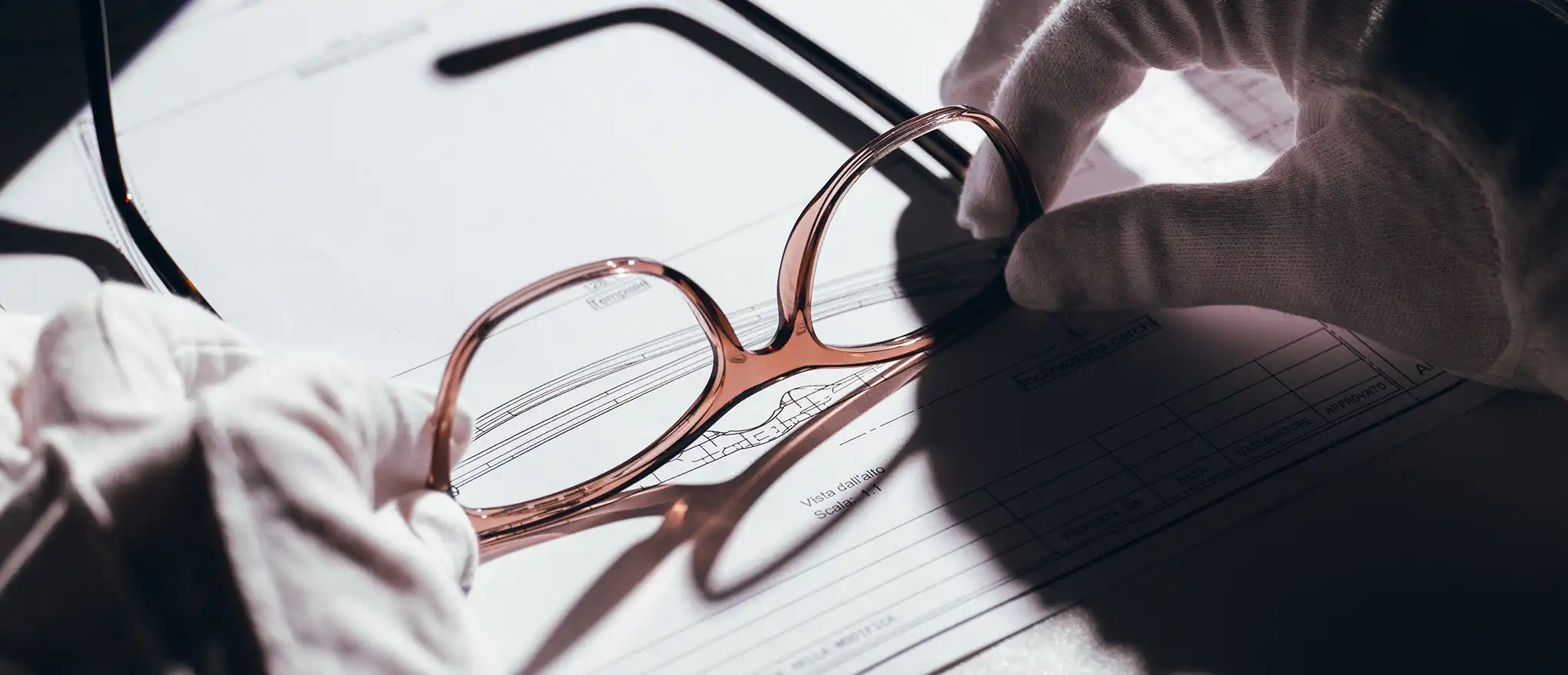 戴着手套的手在技术文件上处理玫瑰色眼镜。